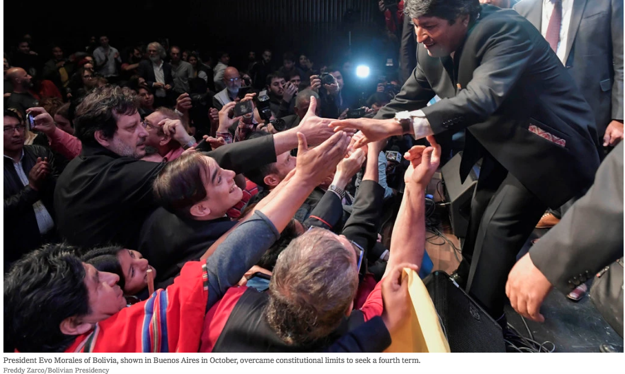 Bolivia’s Constitution barred him from doing so, and Mr. Morales lost a referendum two years ago that would have allowed him to run again. Instead of giving up, he leaned on the courts, which then threw out the country’s term limits.