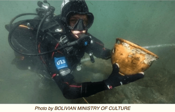 A team of archaeological divers and Bolivian and Belgian experts have located thousands of items in the underwater sites. Some of these pieces will be brought up, but the majority will remain underwater as they are quite well-preserved.