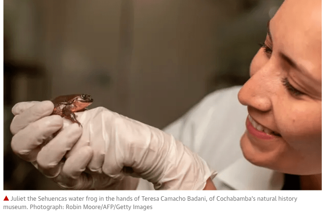 “Now the real work begins – we know how to care for this species in captivity, but now we will learn about its reproduction,” said Teresa Camacho Badani, of the Museo de Historia Natural Alcide d’Orbigny in Cochabamba, who led the expedition. The scientists hope to prevent the extinction of the frog by breeding new generations and eventually releasing them back into the wild.
