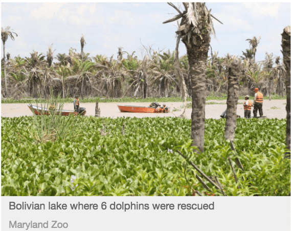 Veterinarians from St. Louis and the Maryland Zoo traveled to central Bolivia to rescue around 15 endangered Bolivian river dolphins that were trapped in a lake. The dolphins had reportedly become cut off from the main river over the past several years because of run-off from environmental changes in the area.