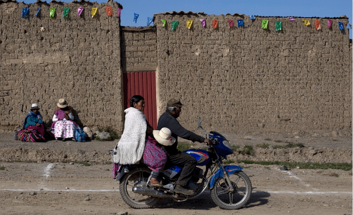 A couple arrive on their motorcycle to the ‘Feria de Ramos’ or Palm Fair, in El Alto, Bolivia. (AP Photo/Juan Karita)