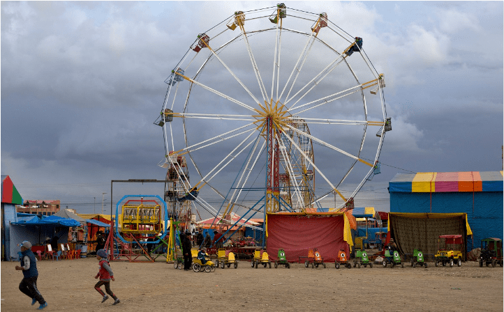 Children run through the midway as workers slowly help fairgoers off a Ferris wheel at the ‘Feria de Ramos’ or Palm Fair, in El Alto, Bolivia. (AP Photo/Juan Karita)