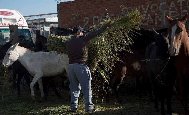 A seller parcels out barely to his horses at the ‘Feria de Ramos’ or Palm Fair, in El Alto. (AP Photo/Juan Karita)