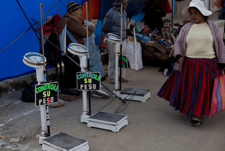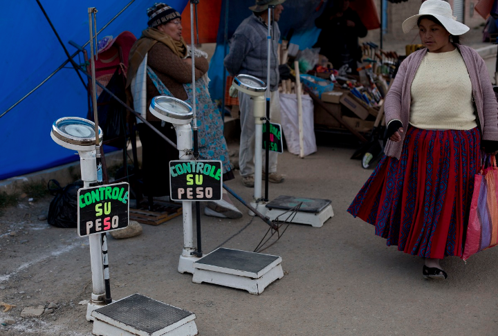 A woman walks past a carnival booth lined with weight scales and signs that read in Spanish: “Control your weight” at the ‘Feria de Ramos’ or Palm Fair, in El Alto. (AP Photo/Juan Karita)