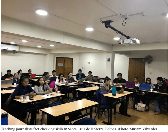 Such was the case last week when Miriam Valverde, a fact-checker covering immigration for (Poynter-owned) PolitiFact (and Daniel’s colleague), traveled to La Paz, Bolivia, to teach fact-checking skills to journalists. Organized by the nonprofit Fundación para el Periodismo, she helped lead multi-day sessions on the methodology of fact-checking and how anyone can debunk hoaxes online.