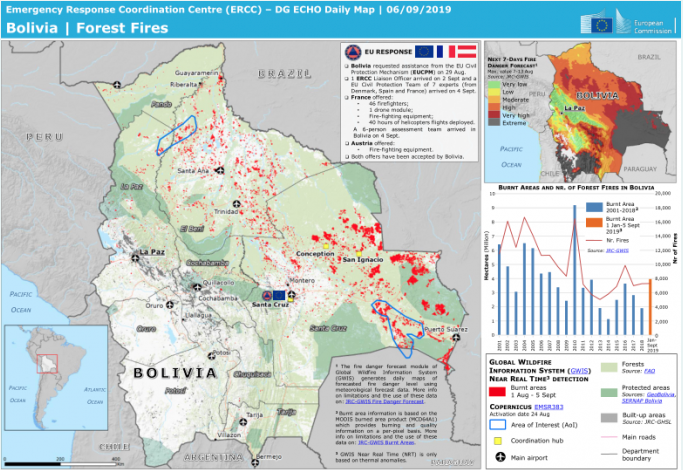 Bolivia, Environment, Politics, Santa Cruz, Social Unrest Bolivia – Forest Fires – DG ECHO Daily Map | 06/09/2019 Posted by Bolivian Thoughts on September 7, 2019September 7, 2019 ReliefWeb reports: MAP fromEuropean Commission’s Directorate-General for European Civil Protection and Humanitarian Aid Operations For better resolution, detail, please download as pdf, use this link https://reliefweb.int/map/bolivia-plurinational-state/bolivia-forest-fires-dg-echo-daily-map-06092019 #SOSAMAZONASBOLIVIA Rate this:Share this: Click to share on Facebook (Opens in new window) Facebook Click to share on LinkedIn (Opens in new window) LinkedIn Click to print (Opens in new window) Print Click to share on Telegram (Opens in new window) Telegram Click to share on X (Opens in new window) X Click to share on WhatsApp (Opens in new window) WhatsApp Click to email a link to a friend (Opens in new window) Email Like Loading... Related Published by Bolivian Thoughts Senior managerial experience on sustainable development projects. View all posts by Bolivian Thoughts