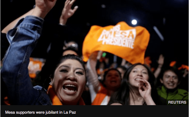 Many indigenous Bolivians continue to back him, saying Mr Mesa – who is running for the Civic Community (Comunidad Ciudadana) political alliance – embodies the white Bolivian elite and question his commitment to the poor.