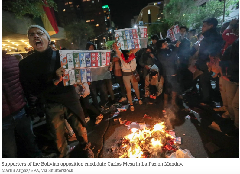 Many Bolivians were suspicious of the result because election officials halted the updating of vote results for nearly 24 hours. Across the country, people posted videos on social media of scenes that purported to show electoral irregularities, including stashes of ballots and other election materials found in residences and vehicles.