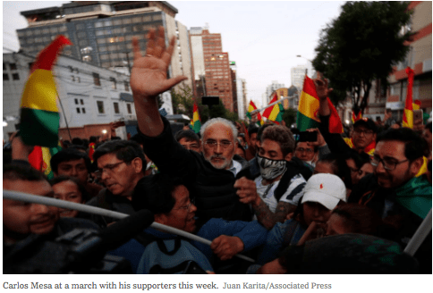 “It’s clear there is a gigantic fraud in the works,” said Mr. Mesa. “We will be permanently mobilized, and I will stand with you, until there is recognition that the second round must take place because it is legitimately the vote of the Bolivian people.”