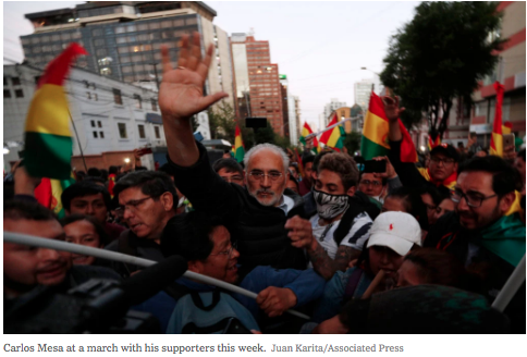 “It’s clear there is a gigantic fraud in the works,” said Mr. Mesa. “We will be permanently mobilized, and I will stand with you, until there is recognition that the second round must take place because it is legitimately the vote of the Bolivian people.”