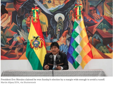 The outcome of the vote has been in dispute since election officials released preliminary results on Sunday night that pointed to a runoff between Mr. Morales and Carlos Mesa, a former president — only to backtrack within 24 hours. On Monday night, election officials released an updated vote tally showing Mr. Morales leading by 10 percentage points, the margin required to avoid a runoff.