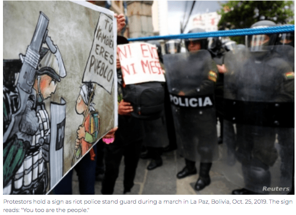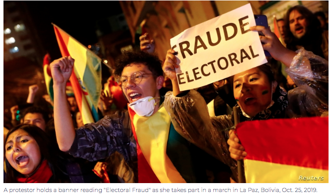 Anti-government protests had begun on Sunday, when an official vote count was suspended for almost a day. A confident Morales said then his socialist party MAS would get an outright win, despite an official rapid count data showing the left-wing leader heading to a second round against rival Carlos Mesa.
