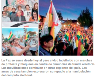 - La Paz joins the indefinite civic strike as of today with protest marches and blockades in repudiation of allegations of electoral fraud