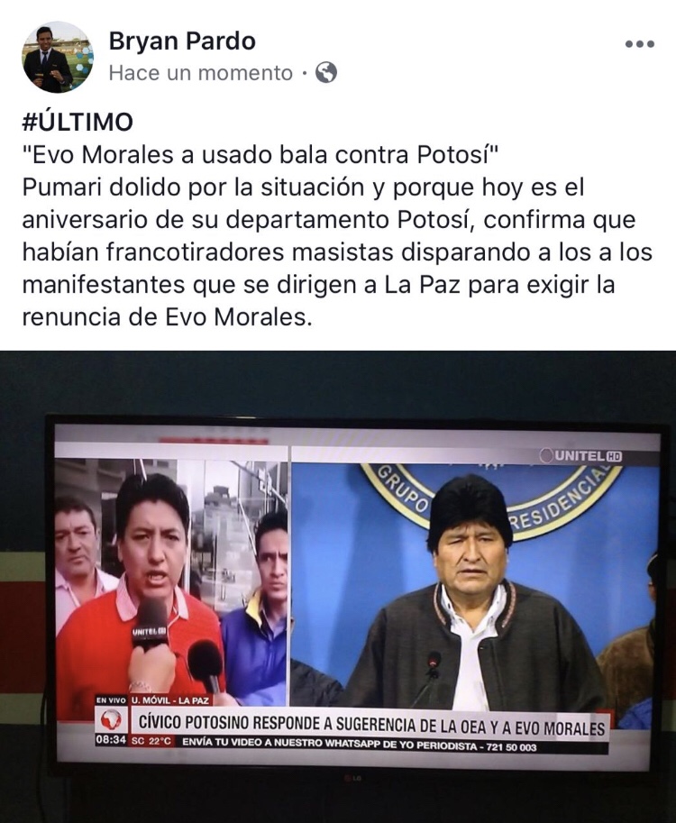 At least three wounded, shot, in the road, from Oruro to La Paz. evo definitely lost his marbles, he is a delusional sick man that only cares about staying in power.