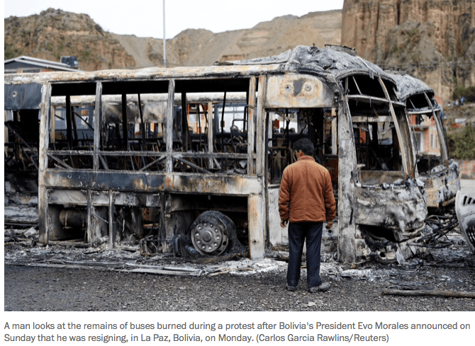 But the military intervention led to a dangerous power vacuum. Mr. Morales and senior legislative leaders from his party all resigned, leaving no one in control of the government. Mobs sympathetic to both sides went on a rampage of looting and arson.