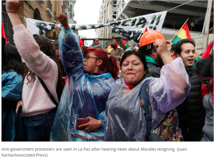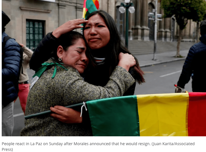 “I am resigning, sending my letter of resignation to the Legislative Assembly,” Morales said, adding that it was his “obligation as indigenous president and president of all Bolivians to seek peace.”