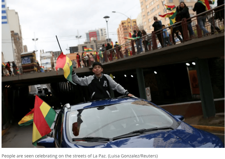 “Today we won a battle,” Camacho told a crowd of cheering supporters in the capital, though he added more time was needed to repair the constitutional order and democracy. “Only when we can be sure that democracy is solid, then will we go back home.”