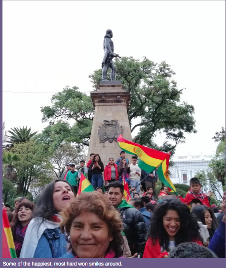 Yes, Evo should not have tried to run for a 4th term. Yet, the social media vitriol some of my facebook friends are flinging against each other is heart-breaking: portraying “masistas” as “the enemy” when they are 46-48% of the voters in the last election (i.e “compatriots”). I’ve seen this very phenomenon on the doorsteps in communities during the UK general election: treating family and friends as enemies when the real forces that control our lives escape scrutiny.