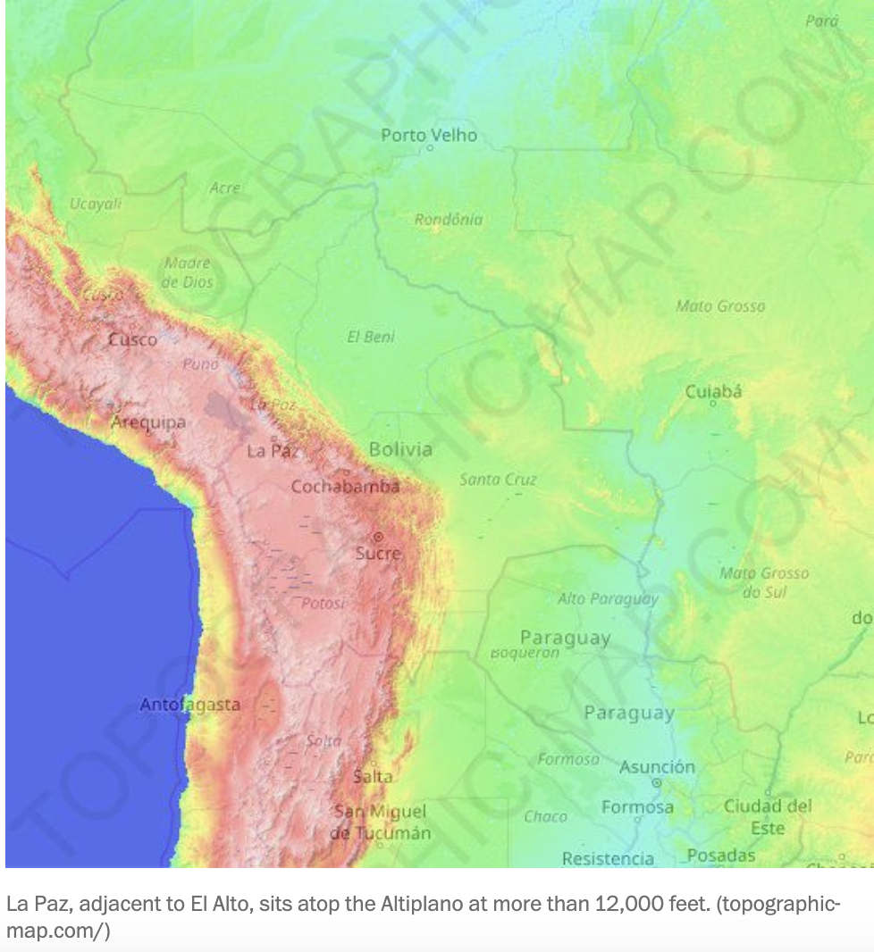 But just to the west is El Alto, an extension of La Paz with about 600,000 people. That’s where the airport is. It’s a steep drive up from La Paz, but is situated on the “Altiplano” — a vast stretch of mostly flat land about 100 miles west to east and 500 miles north-south between the mountains. They’re basically plains, but at 12,000 or 13,000 feet. Lake Titicaca is in the Altiplano.