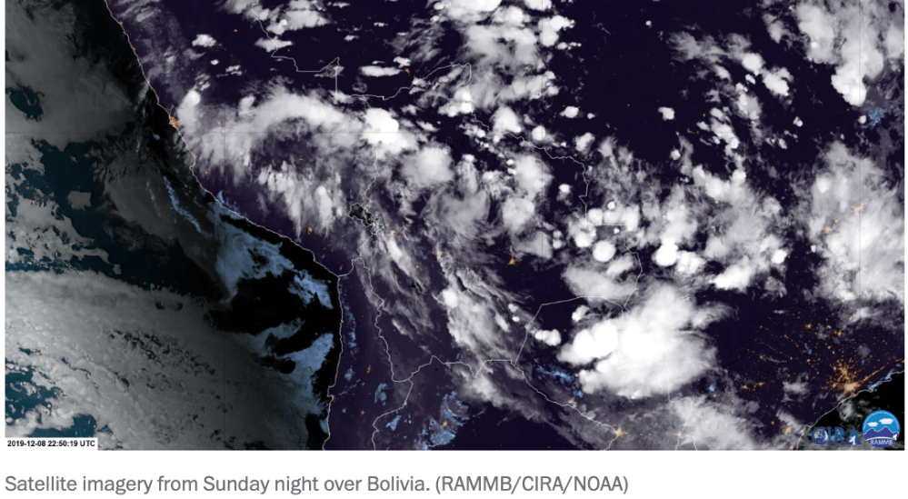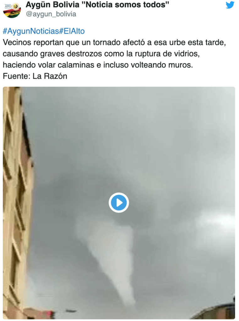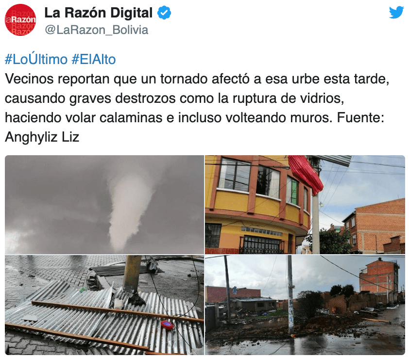 The whirlwind reportedly came without warning from El Servicio Nacional de Meteorología e Hidrología, Bolivia’s equivalent to the National Weather Service. The main weather hazard highlighted before the tornado had been river flooding well to the east amid recent heavy rainfall.