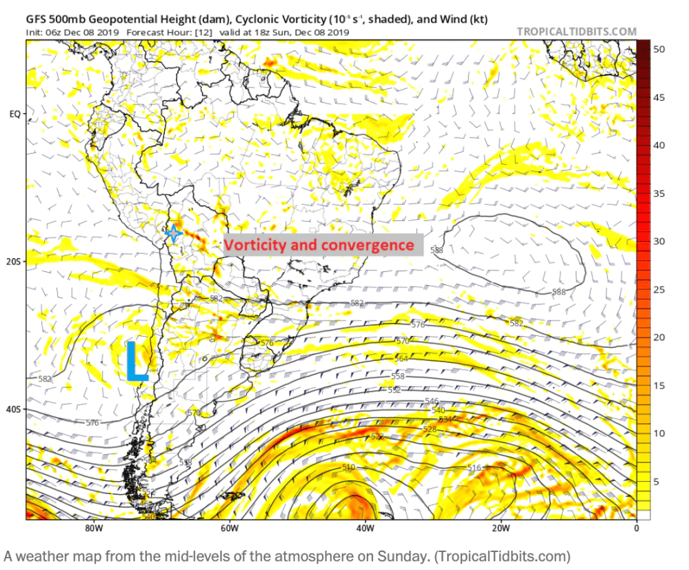 Instead, it looks like the trough of low pressure to the southwest may have helped enhance westerly winds over the Altiplano, while more northwesterly winds were present just to the east. A ribbon of low-level convergence, or colliding winds, may have helped set up a localized boundary that could focus storm development. Models also captured this feature sparking some vorticity, or spin, at the mid-levels of the atmosphere. See the small strip of red modeled to be near La Paz (in a blue/pink star) Sunday: