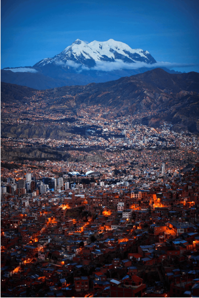 La Paz is the administrative capital of Bolivia, and is home to 800,000 people. It sits at about 11,900 feet. A system of chairlifts and gondolas are strung throughout the city’s mountain terrain, serving as one of the primary means of public transportation. To the east, the Andes Mountains tower to 18,000 feet or more.