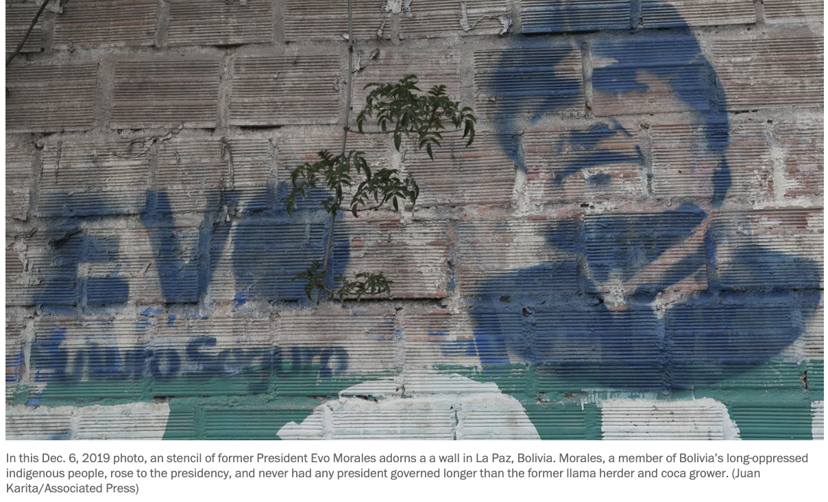 Never before had a member of Bolivia’s long-oppressed indigenous people risen to the presidency. Never had any president governed longer than the former llama herder and coca grower. [Bolivian Thoughts opinion: he was NOT the first indigenous to become president.]