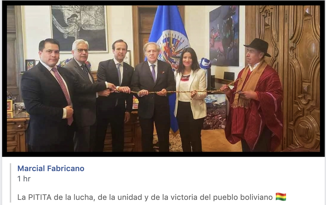 El Diario reports, at the bottom theres is picture from the internet that shows the Bolivian delegation with OAS’ head Almagro, holding the little rope, the symbol of the citizens’ unity and victory: