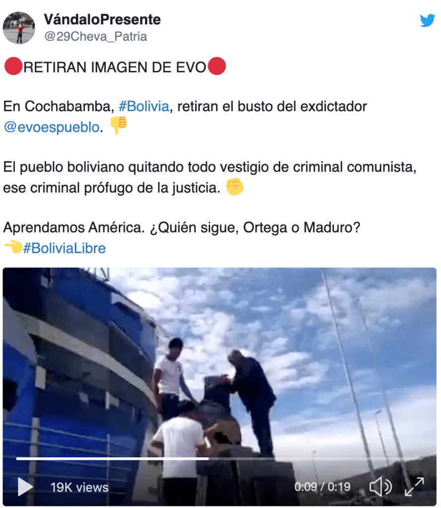 The destruction of Evo Morales’ bust happened hours after he, via radio, summoned Venezuelan-style armed militias to return to Bolivia. Evo’s fourth election, which was against the constitution, was already a source of a latent fear of becoming a Venezuelan-style tyranny.