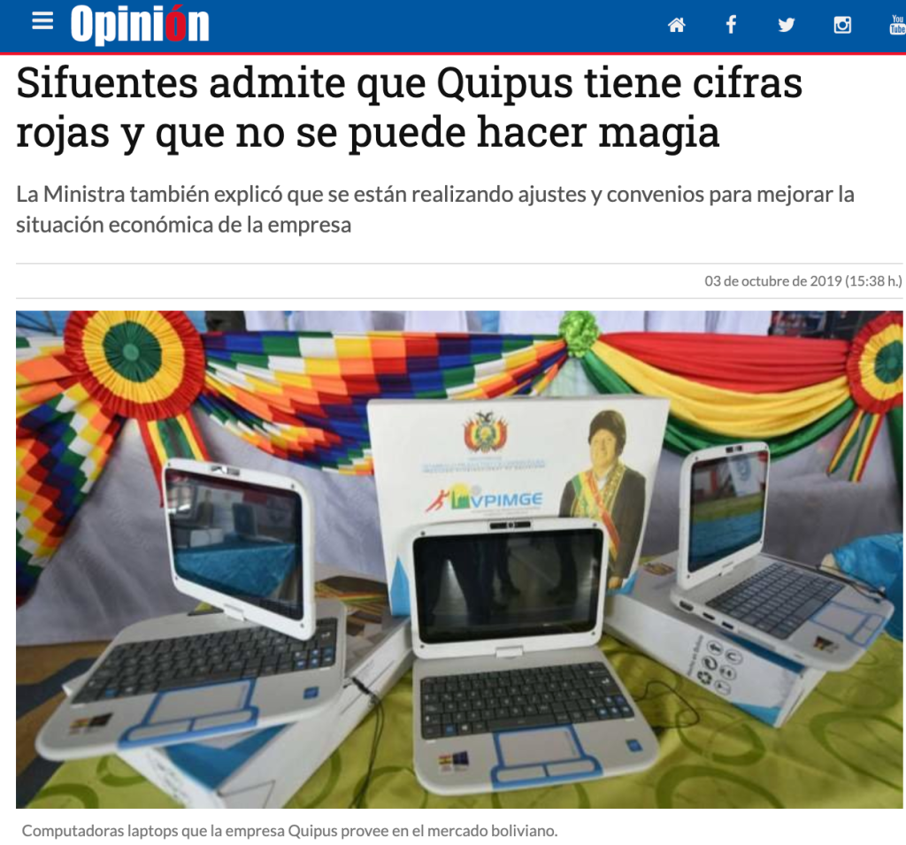 Causa asombro que cada día se descubra alguna otra acción económica descabellada del gobierno de Evo Morales, derrocado del poder hace más de dos meses. Esta vez se trata del negocio irresponsable de la empresa estatal ensambladora Quipus, que significó para el pueblo boliviano un enorme gasto y no ofrece el menor rendimiento y más bien produce pérdidas para la Nación y el Estado.
