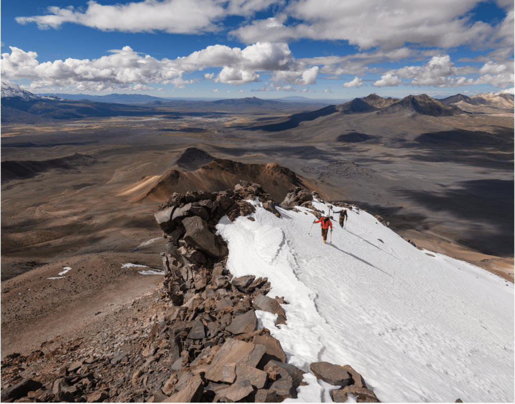 In the morning, we took a two-hour ride—with one short stop so the driver could run his alpacas back onto his land—to the base of Pomerape. We began our ascent walking on pumice and after a few hours, reached the snowline. The altitude didn’t hinder us significantly until we hit 5,700 meters; all of a sudden, it felt like someone was slowly tightening a vice grip on my head. It was our third day in the country, but our first at substantial altitude.
