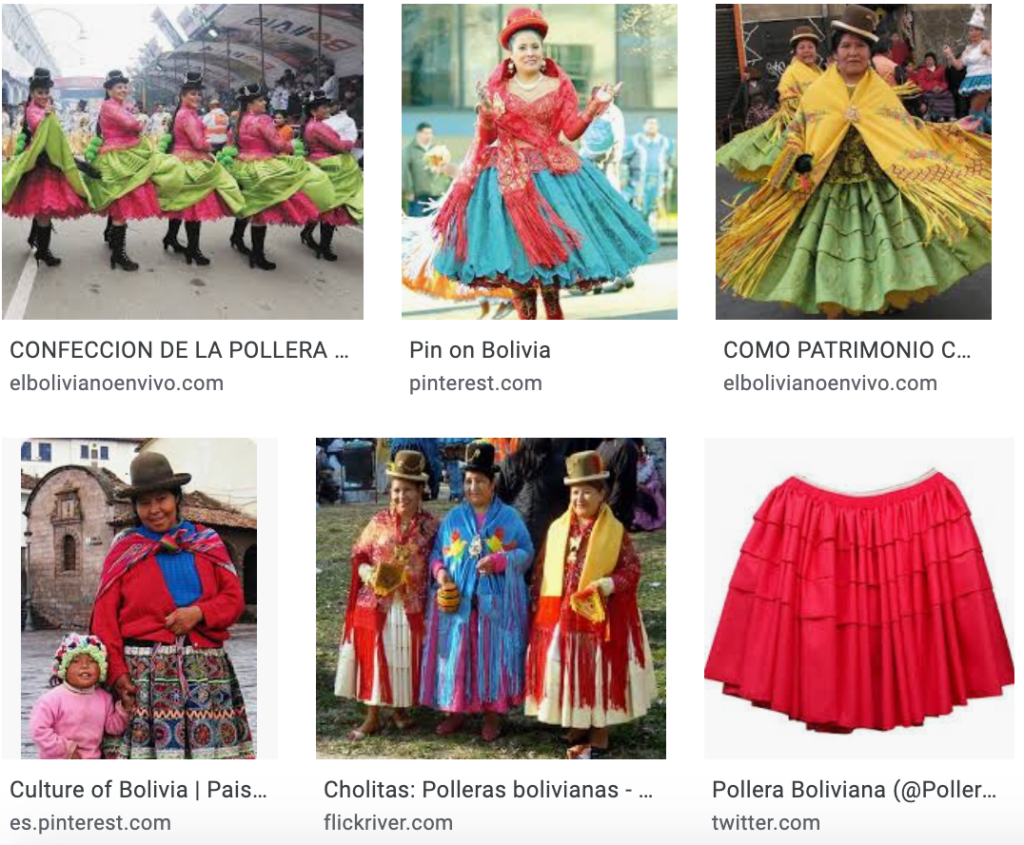 In an immediate historical past, the pollera skirt and its use meant a reality reviled and ignored, its intrinsic values were practically exhausted. However, in recent years an overwhelming narrative about the pollera skirt and chola has been mythologized; coming to exalt it as a symbol or banner of struggle of indigenous peoples. This symbolization is not in itself negative, but has the consequence of abstracting the figure of the pollera skirt in a stereotypical essence of representation “unique, authentic, ethnic and racial” of Aymara and Quechua groups. This inaccurate postulate distances us from the real origin of the pollera skirt as such, and it is an error to maintain that the use and social performance of this clothing goes back to pre-Hispanic times.