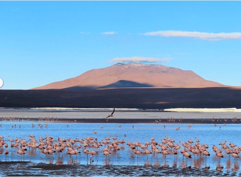 A short distance from a massive hissing fumarole field is the most beautiful lake of all – Laguna Colorada. Guarded by shadowy mountains, the red-tinted salt lake is home to hundreds of roosting pink flamingos and the odd camelid.