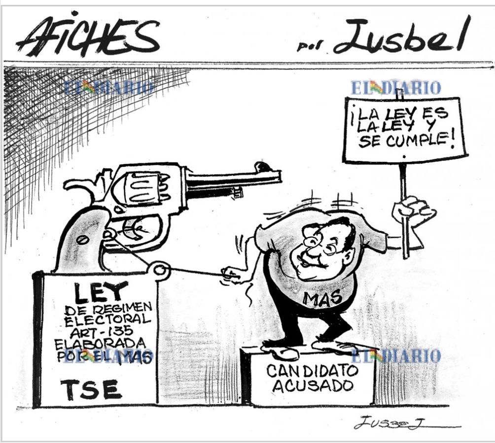 This cartoon shows a law the masistas created to ban their opposition, they ruled out over 200 candidates in Beni, when one of them spoke about a poll.