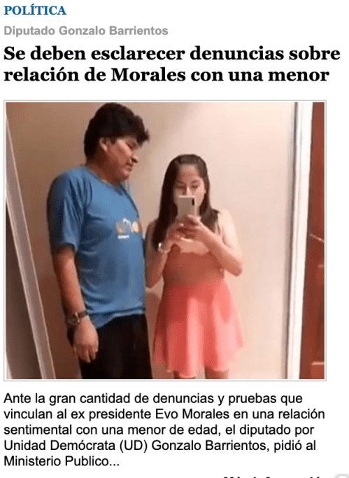 Pero ese secreto a voces ahora ha adquirido un rostro, el de Noemí, con las decenas de fotografías que circulan por las redes sociales. Y un estremecimiento ha recorrido la espina dorsal de millones de bolivianos: ¿qué hacía la casi niña en el gimnasio de Morales? ¿Y de dónde a dónde la llevaba el expresidente en su avión? ¿Para pasar la noche en qué lugar? Y Noemí, como ya indican diversas acusaciones, era sólo una de tantas. Es normal para un líder político sacarse fotos con admiradores. ¿Pero llevar chicas en su avión personal? Hay literalmente decenas de fotos de jovencitas en el avión. ¿Dónde se las llevaba?