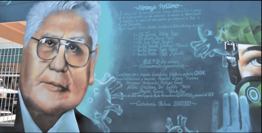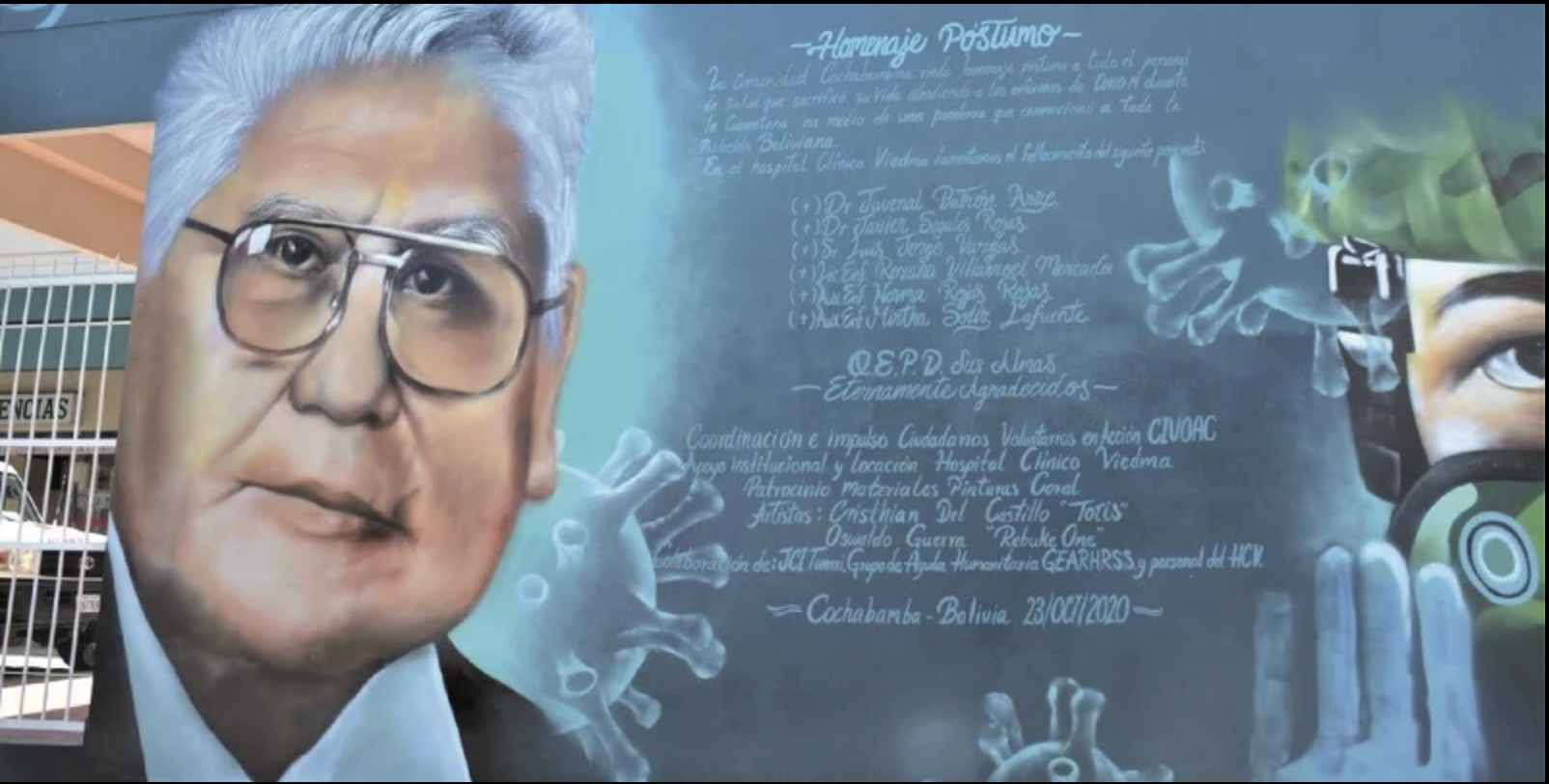 En una cuarta escena, los creadores inmortalizaron el rostro del doctor Juvenal Butrón, el director de cirugías del Hospital Viedma. Este especialista representa a todos los médicos que perdieron la vida por la Covid-19 en Cochabamba y en Bolivia. Para los artistas, este cuadro es también un homenaje póstumo al personal de salud que murió en primera línea.