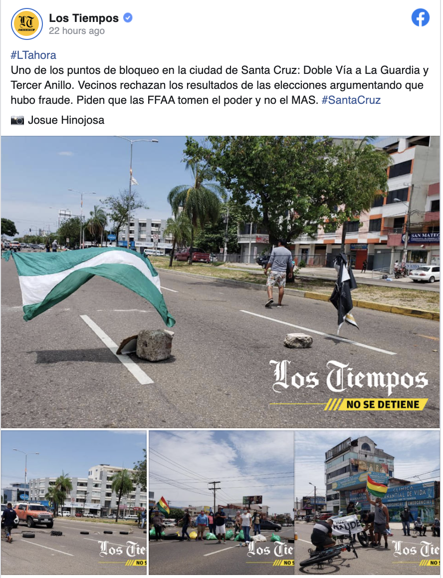 En Santa Cruz, según el corresponsal de este medio, Josué Hinojosa, aseguró que se registraron al menos ocho puntos de bloqueo en toda la ciudad en rechazo a los resultados de las elecciones y pidiendo que las Fuerzas Armadas (FFAA) tomen el poder.