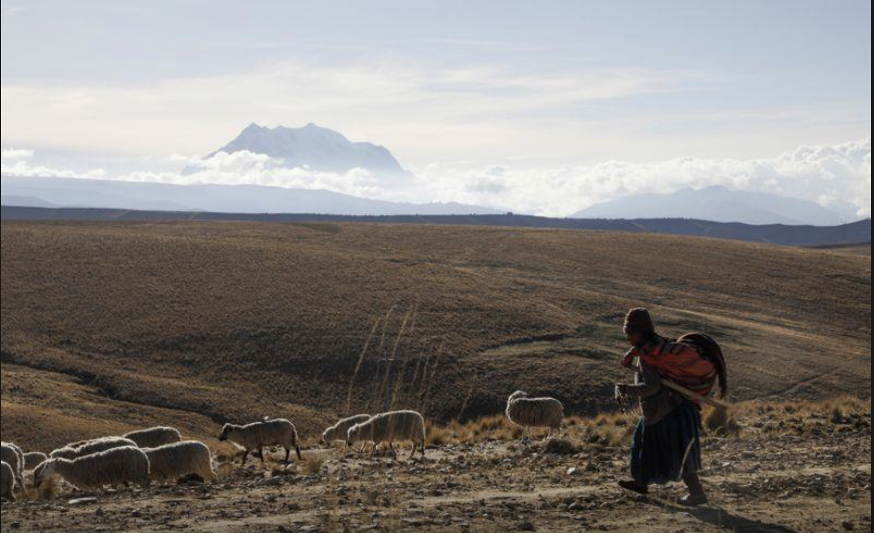 A woman shepherds sheep while the Illimani mountain is seen in the background, near El Alto outskirts of La Paz, Bolivia, December 21, 2020. Picture taken December 21, 2020. REUTERS/David Mercado