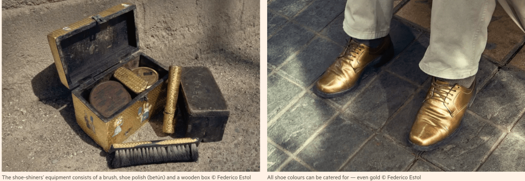 Shoe-shiners may be as young as five — including abandoned children — and there are those in their seventies too. Most are men, but there are also women. There are immigrants from the rural areas of Bolivia and high-school students working to help their poor families. Young mothers shine shoes to help their parents.