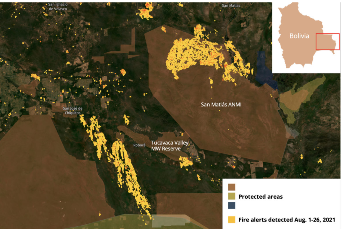 Despite the current fire crisis and the high risk for subsequent breakouts, satellite data and imagery show fires burning in areas used for industrial agriculture immediately surrounding Tucavaca Municipal Wildlife Reserve and San Matiás ANMI.