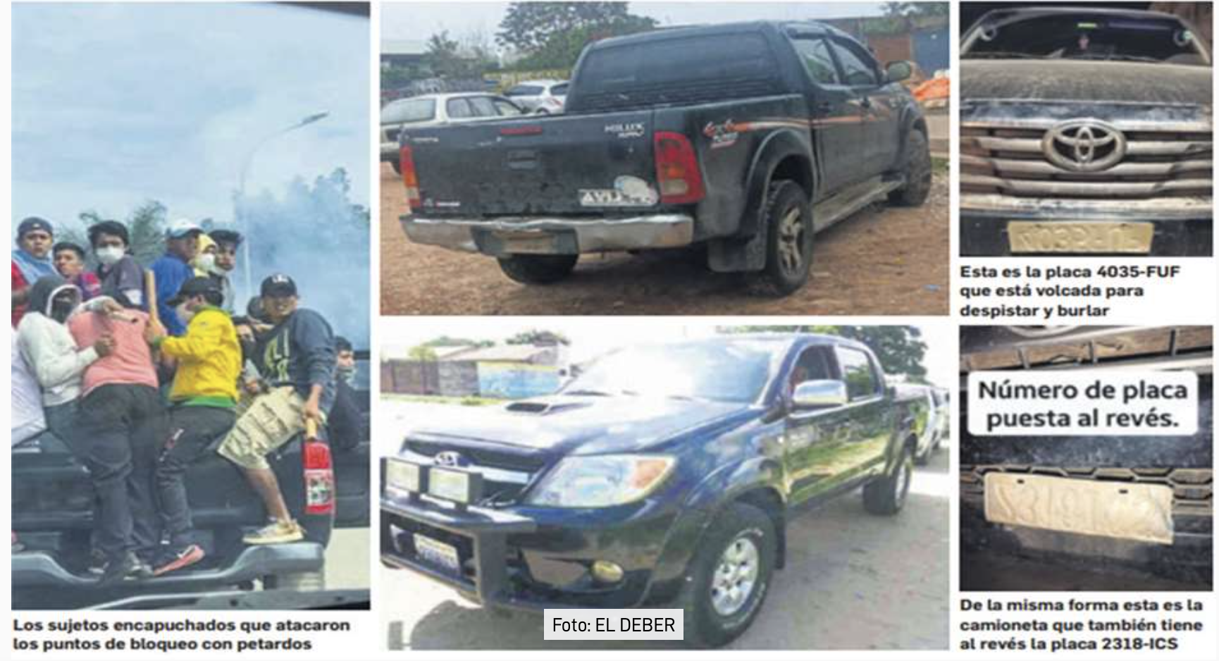 Al menos dos de las tres camionetas que transportaron a los encapuchados, que recorrieron la ciudad atacando los puntos de bloqueo con petardos y piedras, son vehículos incautados al narcotráfico y dependen de la Dirección de Bienes Incautados (Dircabi), que es parte de la estructura del Ministerio de Gobierno.