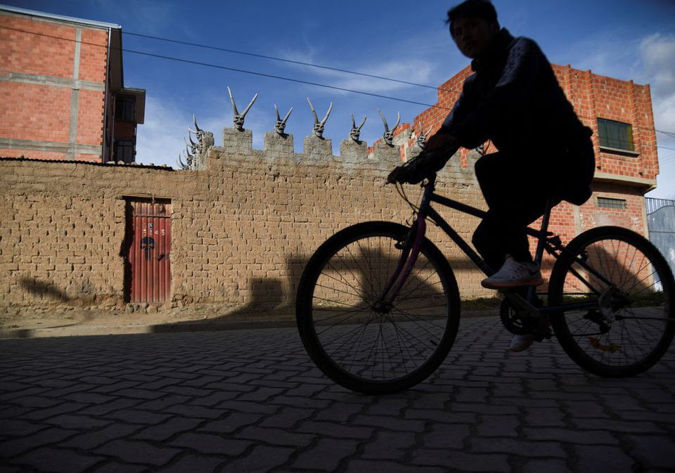 The adobe-brick house in the high-altitude city of El Alto belongs to David Choque, who hired an artist to create the skeletal devils from cement and wood and installed them on his roof, doors and walls.