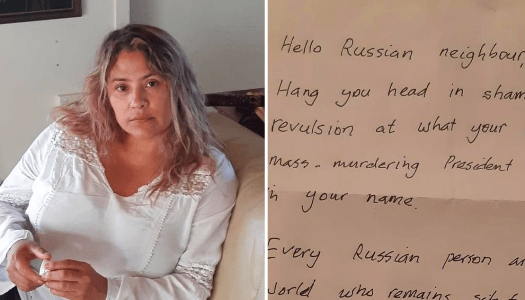 Dirigida a ‘Russian Margo’, la nota sin nombre y sin sello se dejó en su buzón en algún momento del viernes pasado, al final de una semana en la que hubo protestas en todo el mundo por la masacre de civiles ucranianos por parte de soldados rusos en la ciudad de Bucha.