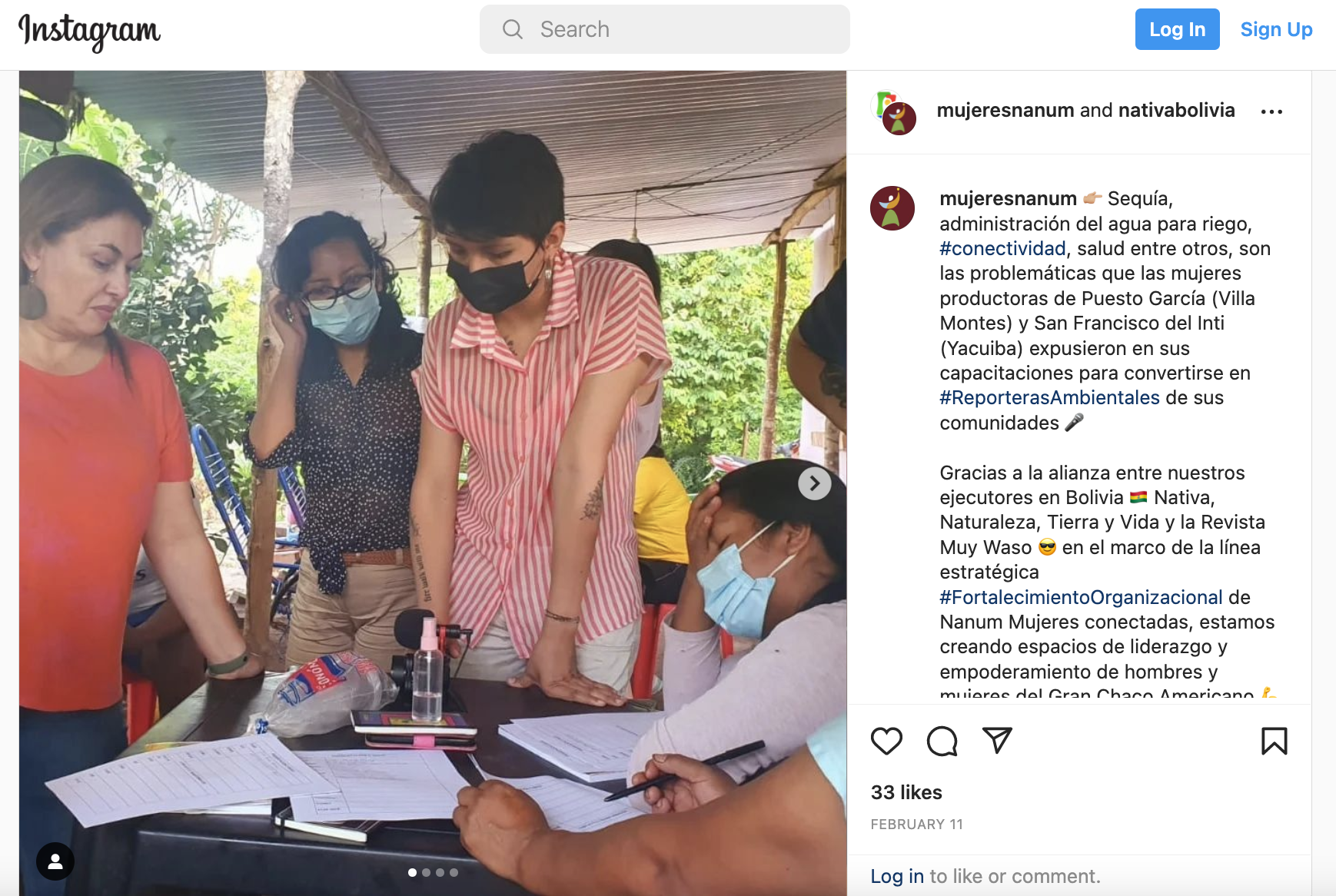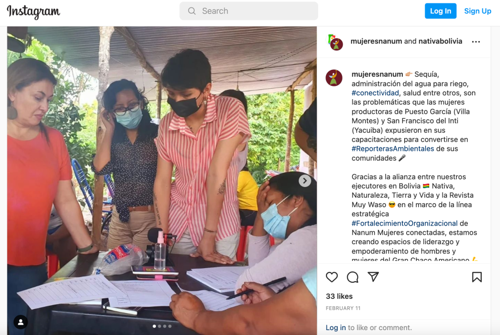 Also providing citizen journalism training is the media outlet Muy Waso in partnership with the Nativa Foundation and Mujeres Nanum. Other activities such participatory mural projects in the towns of Charagua, Villamontes, and Puerto Quijarro organized by artist Knorke Leaf also provides actions to introduce narratives in offline settings.
