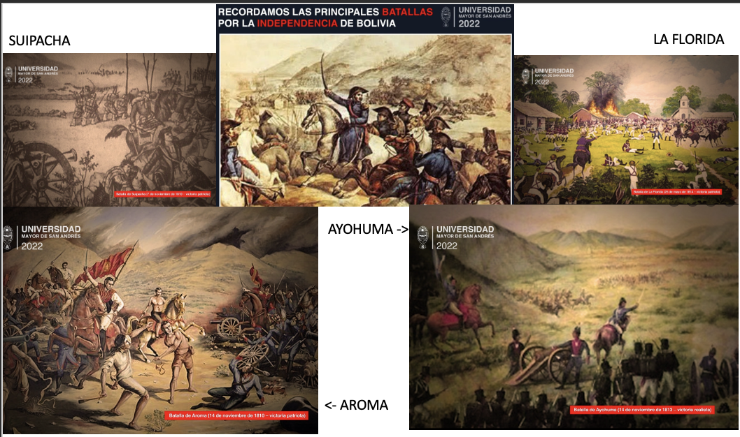 #UMSAremembers | Between 1809 and 1825 a series of battles took place that led to the independence of Bolivia. In this warlike conflict, patriots emerged, men and women who fought to free themselves from the Spanish yoke. We summarize some of the military confrontations that took place in that period: