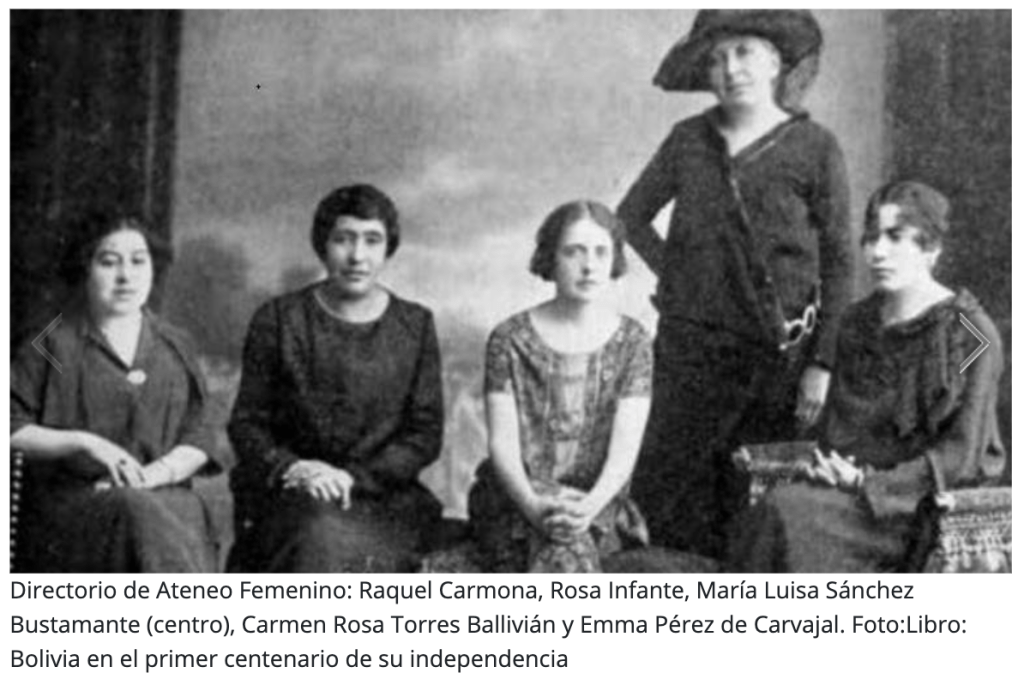 María Elvira Álvarez Giménez, in her book Feminist Movement and the Right to Vote in Bolivia (1920 – 1952) argues that the Women’s Athenaeum became the benchmark organization for the defense of women’s rights from 1920 to 1940. It was the the first center that organized a constant campaign for women to acquire civil and political rights, she adds.