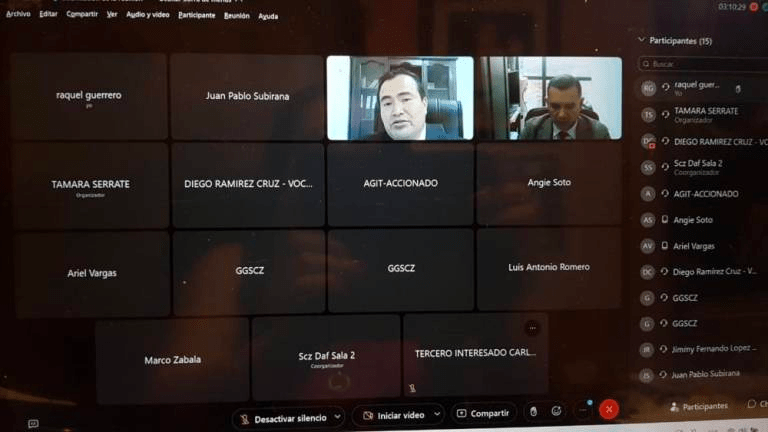La audiencia llevada adelante por los vocales Jimmy López y Diego Ramírez de la sala Constitucional Cuarta del Tribunal Departamental de Justicia de Santa Cruz. Captura de video.