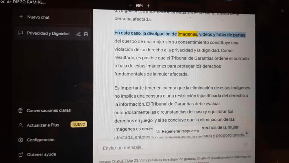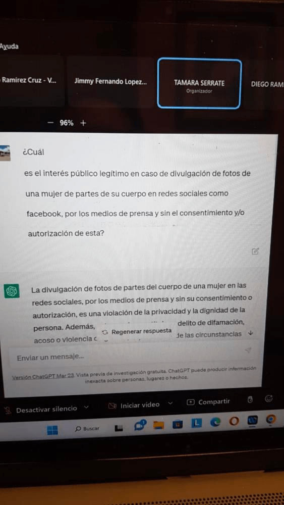 En las capturas de la audiencia de los periodistas se observa como el ChatGPT define que “la divulgación de fotos de partes del cuerpo de una mujer en las redes sociales, por los medios de prensa y sin su consentimiento o autorización, es una violación de la privacidad y la dignidad de la persona”.