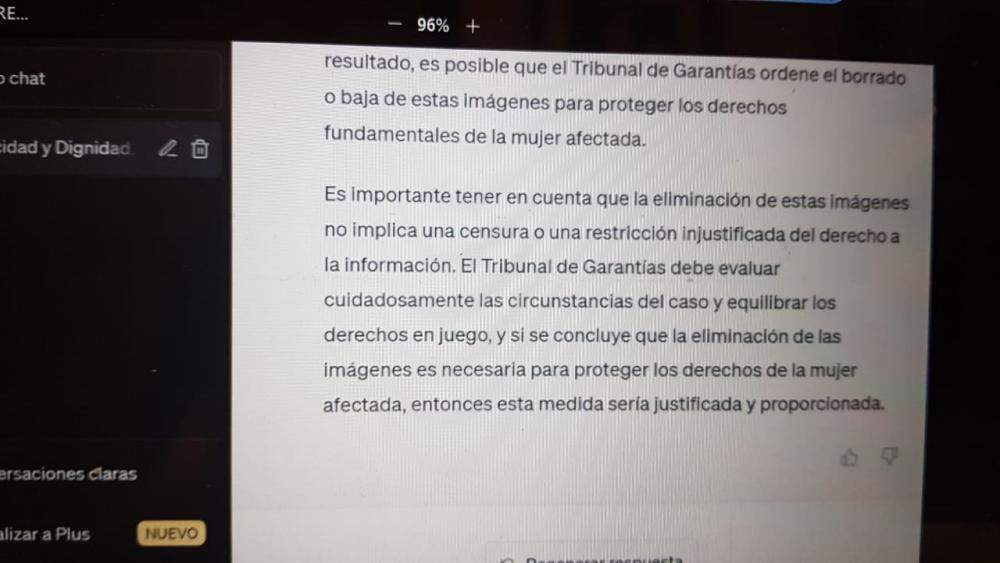 And consequently it resolves: “It is possible that the Court of Guarantees orders the deletion or removal of these images to protect the fundamental rights of the affected woman. It is important to note that the removal of these images does not imply censorship or an unjustified restriction of the right to information. The Court of Guarantees must carefully evaluate the circumstances of the case and balance the rights at stake, and if it is concluded that the removal of the images is necessary to protect the rights of the affected woman, then this measure would be justified and proportionate.”