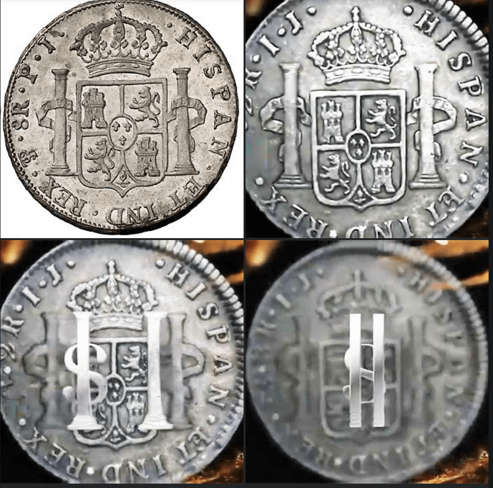 En cuanto al signo del dólar, el conocido «$», las barras (comúnmente se dibujan dos barras verticales y no una) provienen, según la opinión más extendida, de las dos columnas de Hércules de las monedas potosinas, estilizadas. De hecho, cuando surgieron las primeras monedas acuñadas por Estados Unidos, se les denominó también «pillar-dollar», por los dos pilares o columnas de Hércules. Y en cuanto a la S, según la versión más generalizada se trata de una abreviatura de la palabra «peso», como era llamado el real de a ocho, con la P y la S superpuestas.
